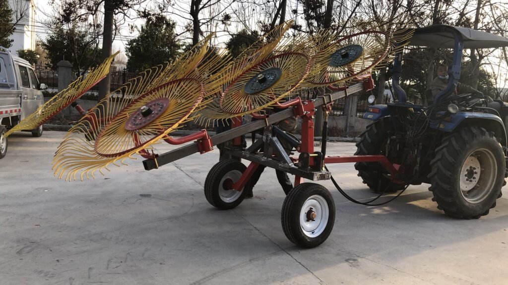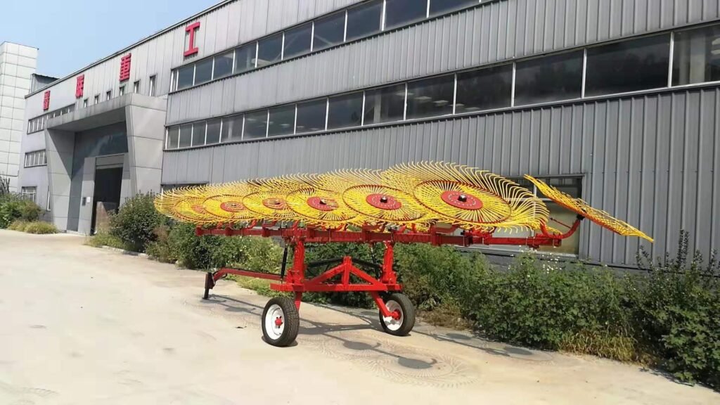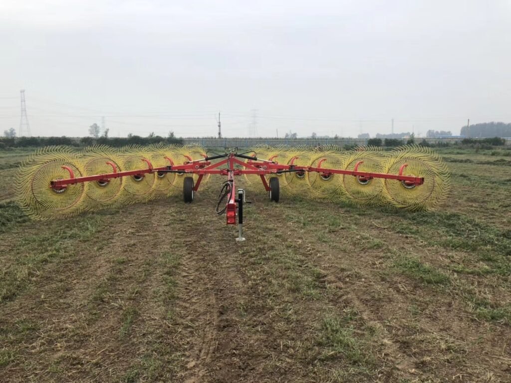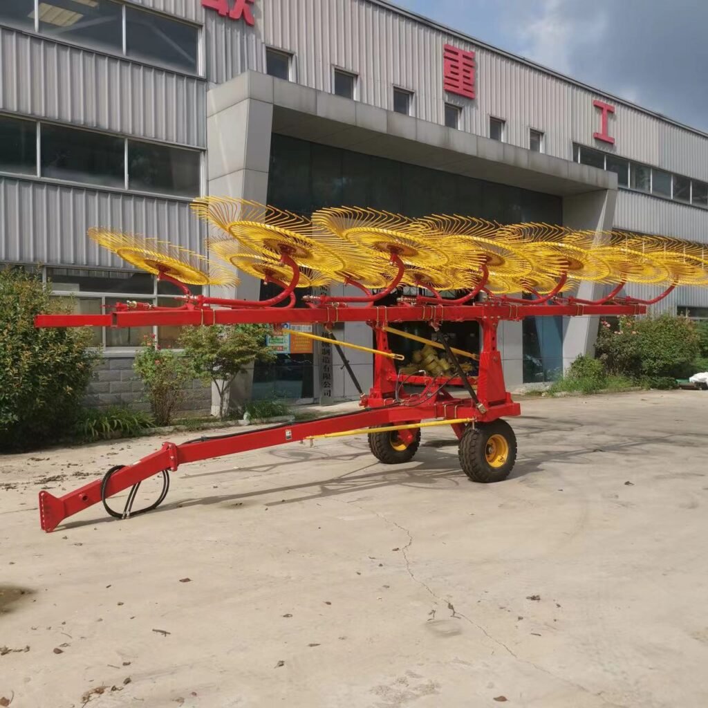 Xinlian brand hay rake is a type of machinery used for harvesting grass that is scattered on the ground and converting it into hay strips. The purpose of raking is to allow the grass to dry thoroughly and facilitate the collection of dry hay. According to the relationship between the direction of the hay strips and the forward direction of the machine, hay rakes can be divided into two major categories: horizontal and lateral. The integrated hay strips are parallel to the forward direction of the machine. The shape of the hay strips is neat, loose, and uniform. The distance the grass moves is small, and there are few impurities. It is suitable for high-yield natural grasslands and artificial pastures.